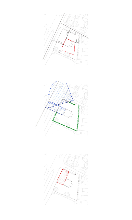The proposal locates a tiny house in the south west part of the garden to block of the noise and view on the rather busy road. The owner will temporarily live in it during the renovation. When the main dwelling is finished the owner is able to use it as a guest house and even rent it out. The position of the tiny house is carefully placed in harmony with the motives of the building regulations. Also this intervention leaves a beautiful private garden in the south east part of the plot with a view over the horse riding field.